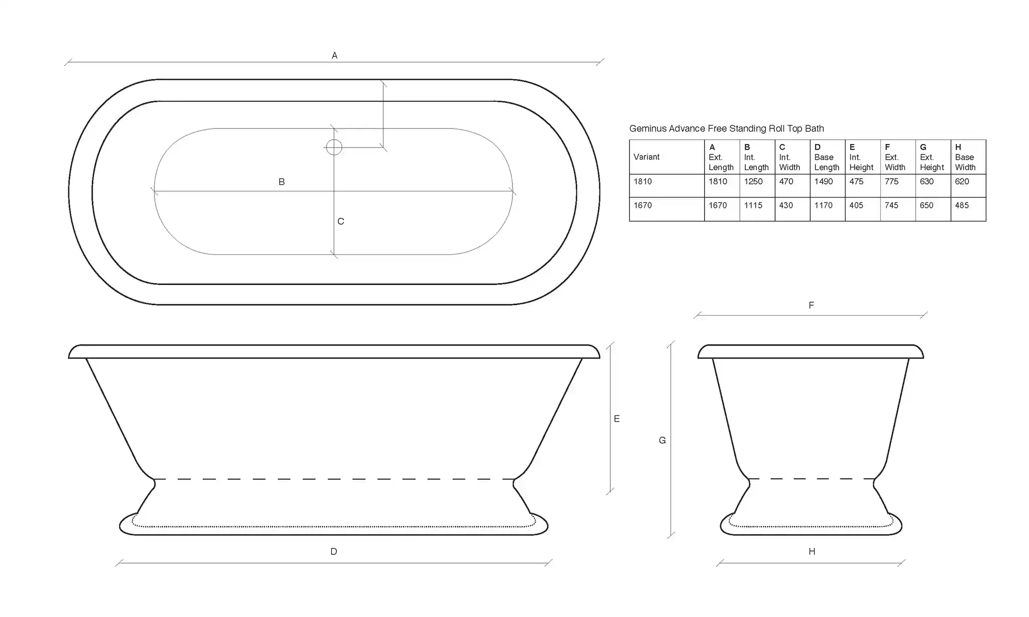 Available in two lengths: 167mm and 1810mm. The Geminus Advance 1670mm version is available with either a full roll (no tap holes in the rim of the bath) or our “tap turrets” version (taps fit on the rim of the bath at the rear/overflow side of the bath). The 1810mm bath is only available with a full roll (no tap holes in the rim), so you will need either wall-mounted or freestanding (standpipe) taps to complete your installation.