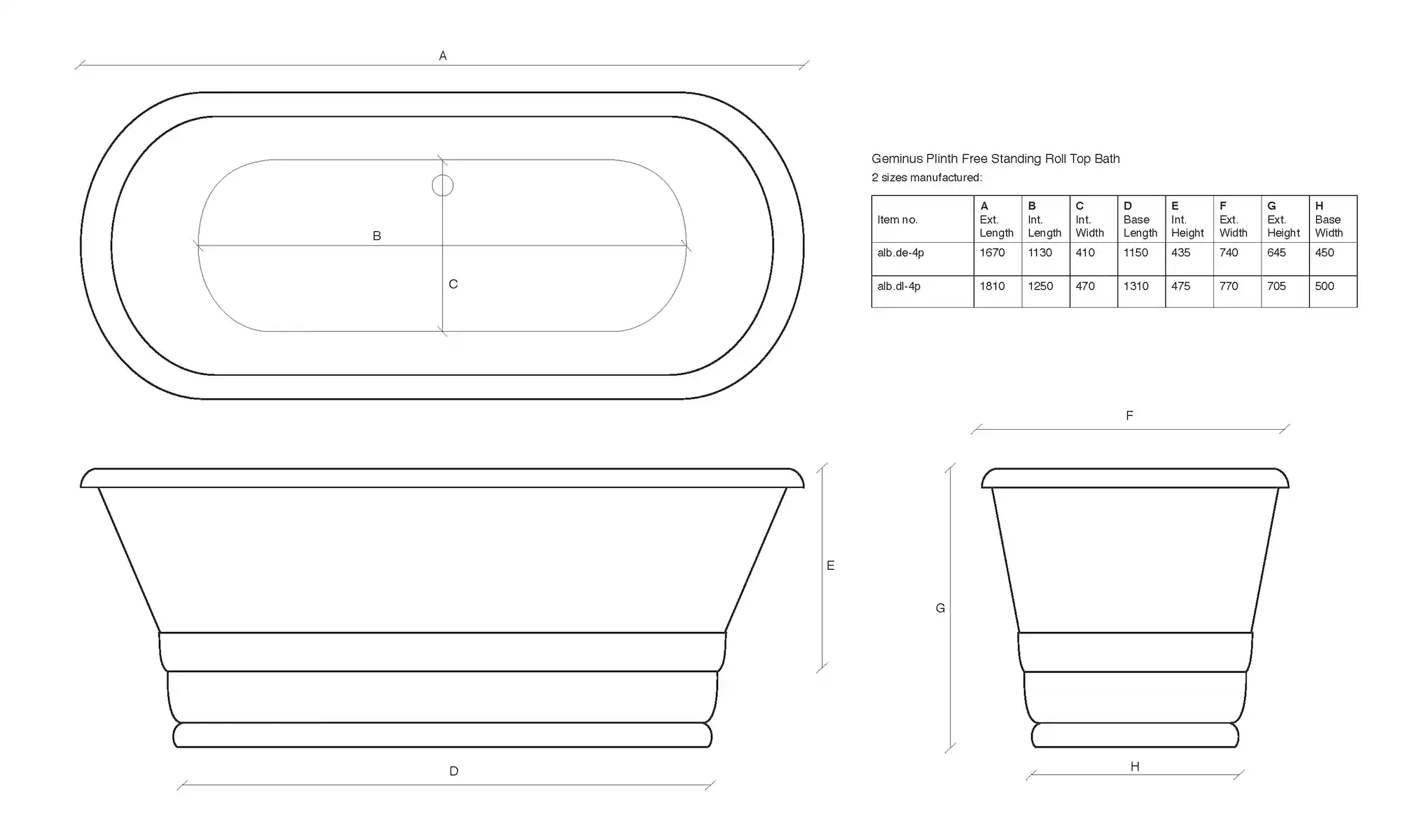 The Geminus Plinth 1670mm version is available with either a full roll (no tap holes in the rim of the bath) or our “tap turrets” version (taps fit on the rim of the bath at the rear/overflow side). The 1810mm bath is only available with a full roll (no tap holes in the rim), so you will need either wall-mounted or freestanding taps (with a standpipe) to complete your installation.
