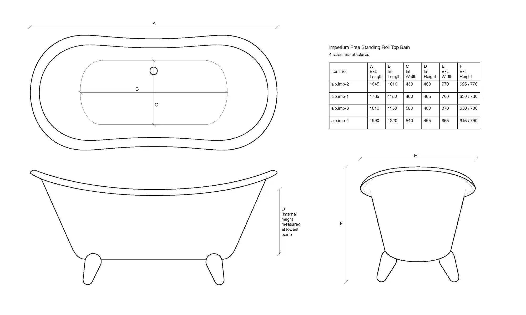 Available in three lengths: 1645mm, 1765mm, and 1810mm. Imperium is only available with a full roll (no tap holes in the rim of the bath), so you will need either wall-mounted or freestanding (standpipe) taps to complete your installation.