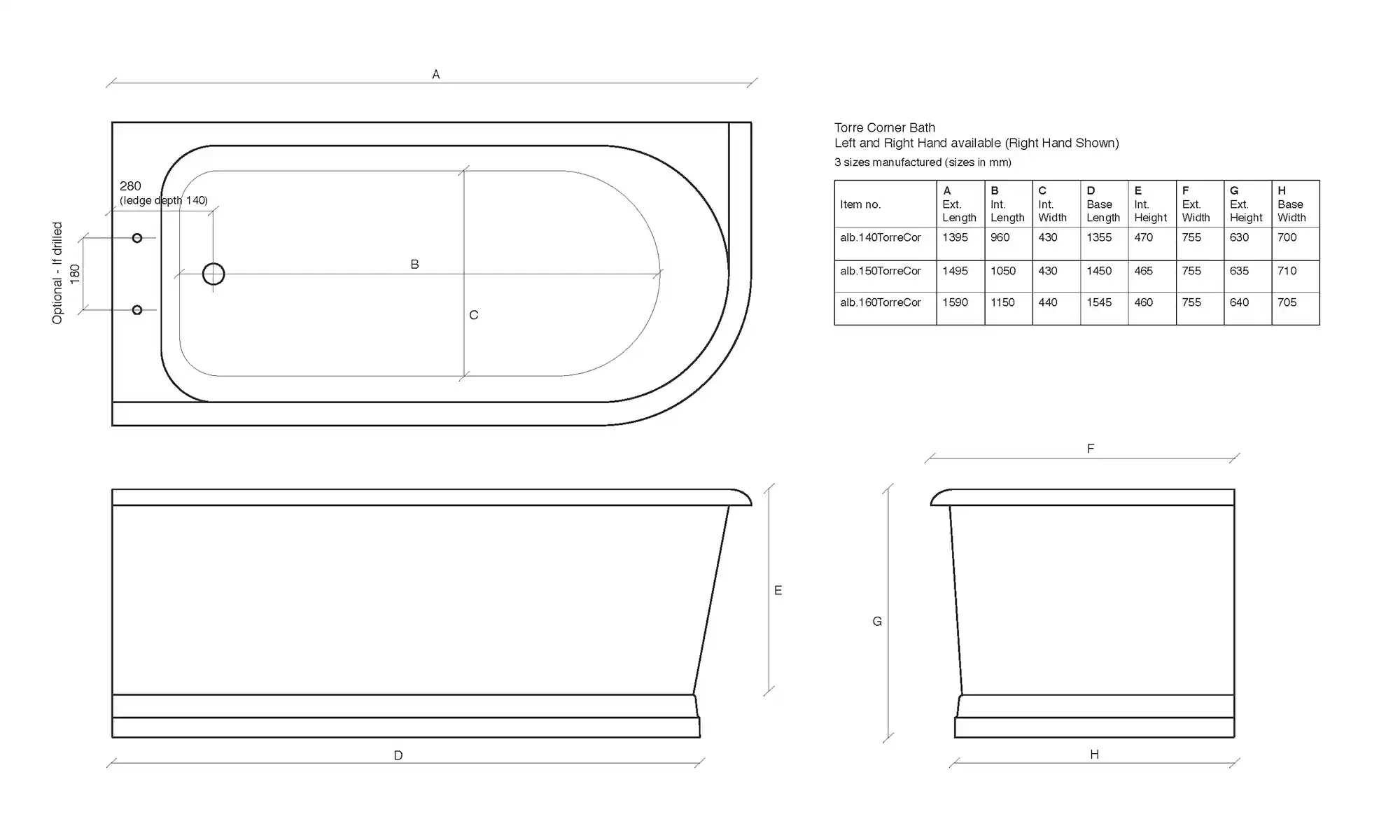Torre Corner can have the flat deck above the overflow at the end of the bath drilled to accommodate standard 180mm centres taps. Otherwise, the deck can be left without tap holes to facilitate wall-mounted taps. The bath comes in left and right-hand configurations.