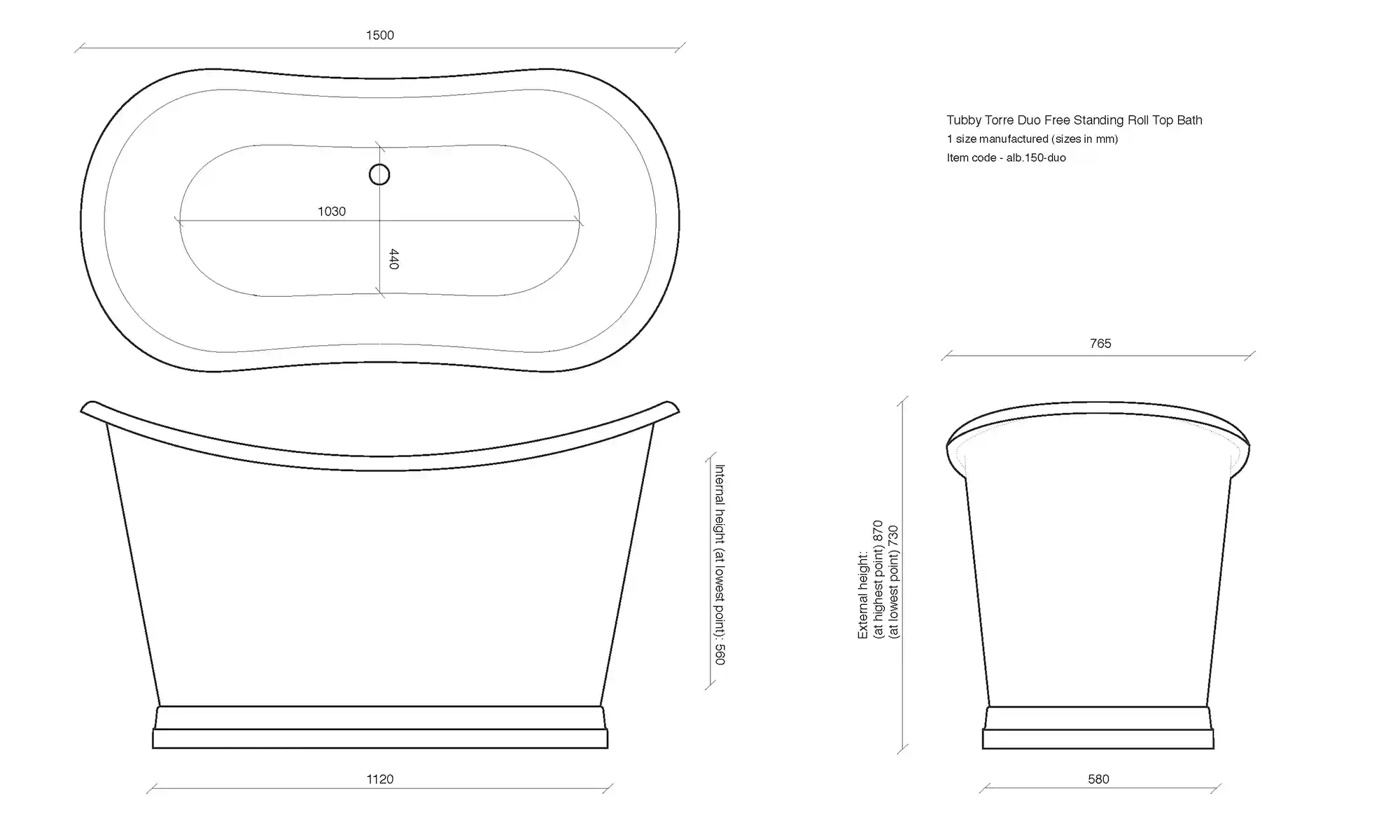 Our Torre Duo handmade double ended bath is 1500mm long and deep. Paintable in a large range of colours for your personalisation.