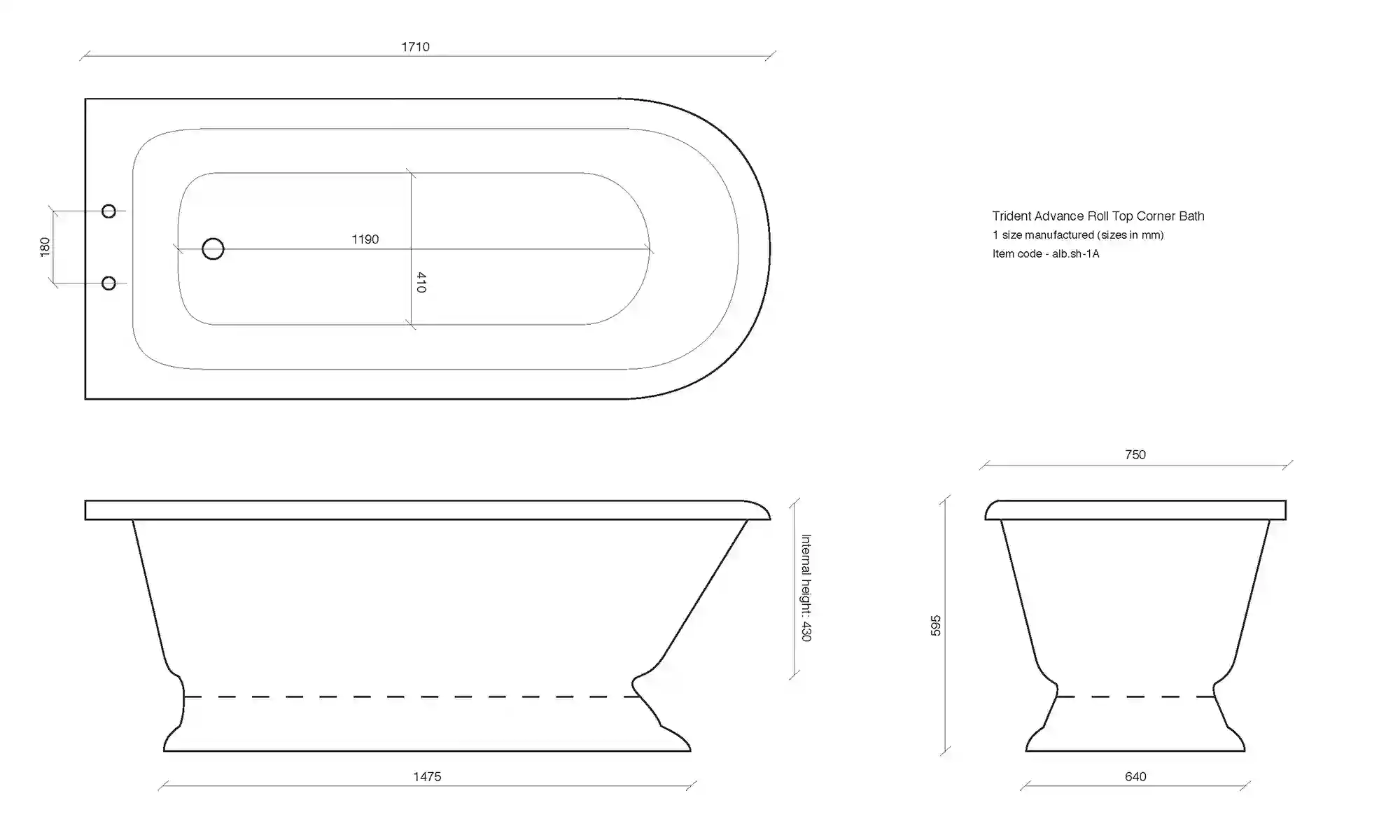 We wanted to make a “to floor” version of our Trident bath, so we used the shape of the base used on the Imperium Plinth and came up with a new twist on our classic combined corner shower bath. The Trident Advance corner-fitted bath was born.